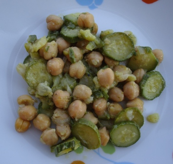 In una casseruola ho fatto dorare la cipolla a fettine sottili in un pò di olio evo, ho aggiunto i ceci e mezzo bicchiere di acqua e una puntina di cucchiaino di curcuma (in alternativa ci starebbe bene anche lo zafferano che ho sperimentato con i ceci in altre ricette).
